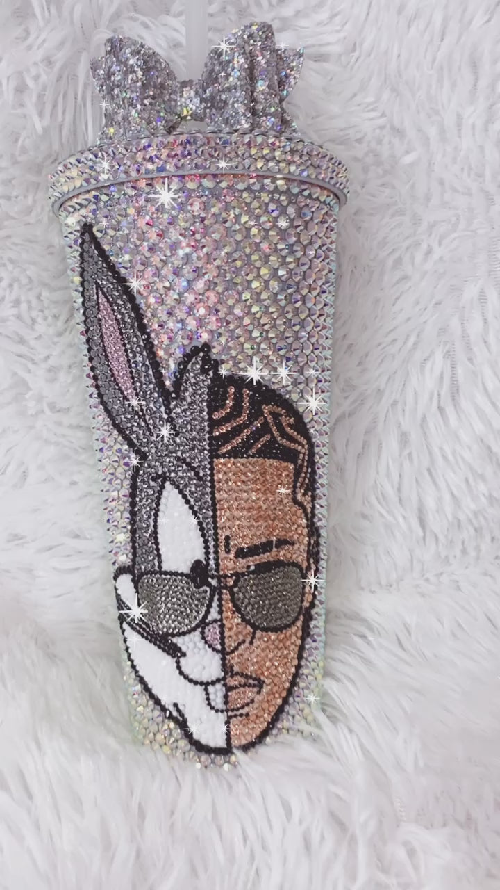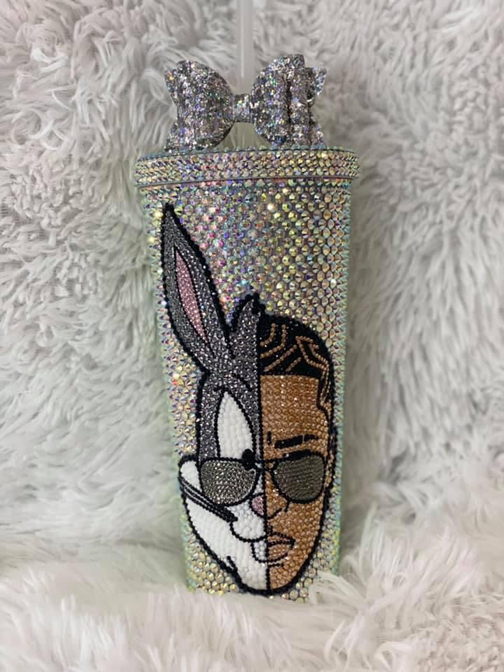 Introducing the extraordinary custom Bad Bunny TUMBLER, a unique fusion of urban flair and expert craftsmanship. This exclusive creation pays homage to the inimitable style of the reggaeton sensation, Bad Bunny, and is meticulously adorned with hand-applied stones that exude unparalleled artistry.